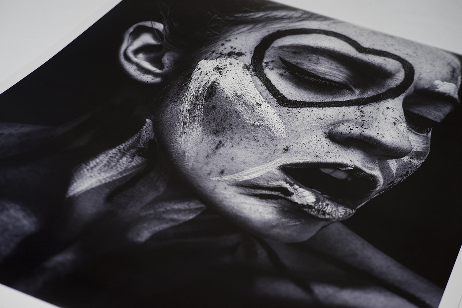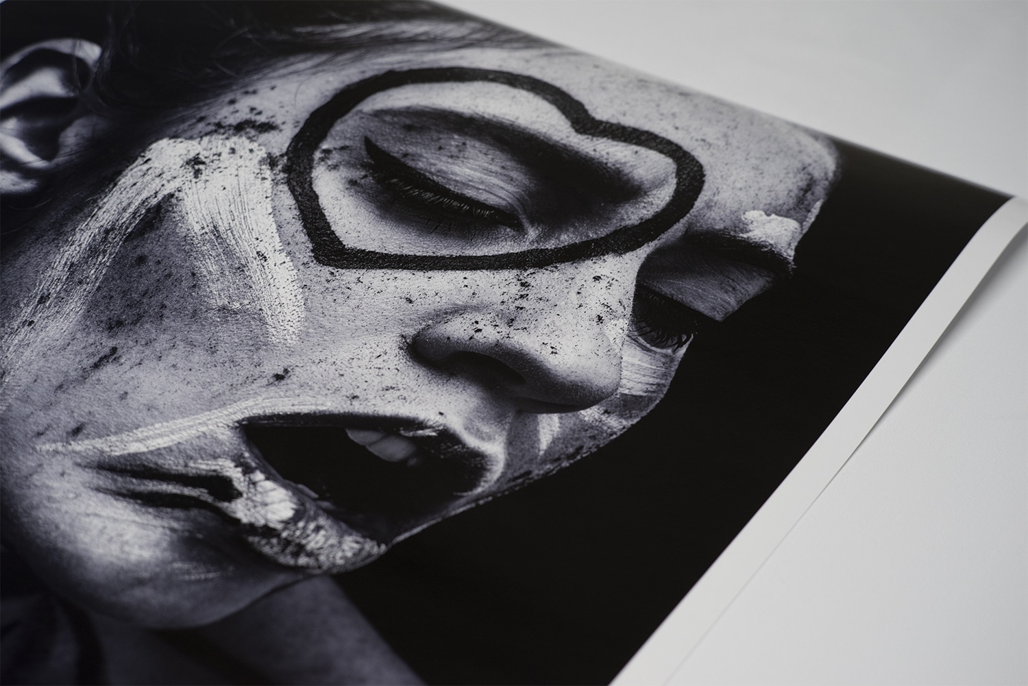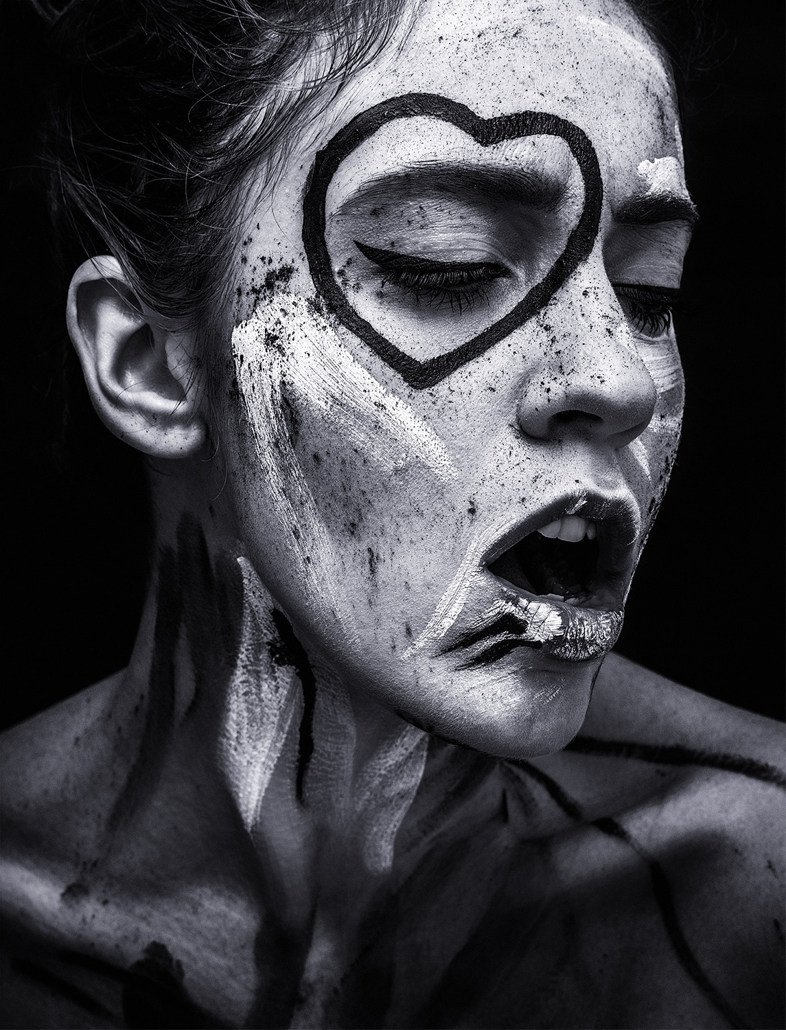 “Woman I” is a visual representation of the contradiction between softness and rawness, fragility and strength. The paint on the skin does more than decorate—it frames an expression of introspection and vulnerability. The heart drawn on the face becomes an ambiguous symbol: love, irony, or perhaps a mark of identity that defies singular interpretation.